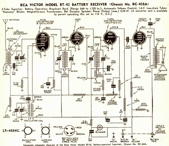Este diagrama de un receptor portátil de 4 tubos se encontró en una revista de 1941. El receptor portátil de onda media tenía 4 válvulas y una antena externa. La salida estaba en el altavoz y los pasos de IF de 455 kHz. Las válvulas tenían filamentos de 1,5 V.