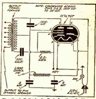 Este circuito usa un tubo con un filamento de 117 V de la década de 1940. El transformador es el tipo de salida para dispositivos de válvula. Se le puede conectar un altavoz o incluso unos auriculares de impedancia, según las tomas disponibles. La frecuencia depende del capacitor en paralelo con los devanados y se puede cambiar.