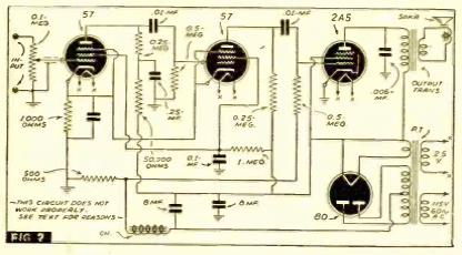 Este pequeño amplificador de 4 válvulas, uno de los cuales es un rectificador de onda completa, se encontró en una publicación de 1941. El circuito tiene una salida de altavoz y puede usarse como caja de resonancia para sonido ambiental. La potencia es de unos pocos watts.
