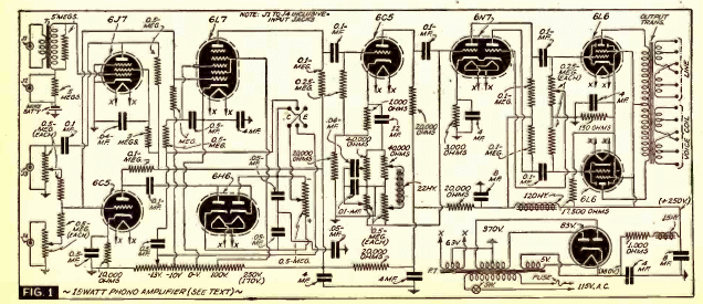 Ya disponible en ese momento, este potente amplificador con el 6L6 se encontró en un Radio Craft de 1941. El circuito de 9 válvulas, siendo el inversor de doble fase, tiene una salida de contrafase que proporciona unas pocas decenas de vatios de salida. El circuito tiene rectificación de onda completa y está indicado para aplicaciones en sonido ambiente.