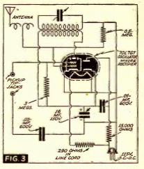 Este circuito de una válvula es de una documentación técnica de 1941. La simplicidad radica en el uso de un doble tubo, medio oscilador y medio rectificador. El circuito se alimenta directamente de la red y tiene un alcance de algunas decenas de metros en el rango de onda media o dependiendo de la bobina oscilante. La antena es un trozo de alambre de 1 metro a 5 metros.