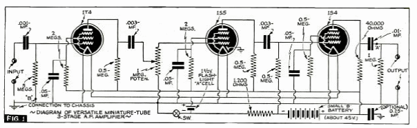 Este amplificador en miniatura de 3 válvulas se encontró en una documentación de la década de 1940. Alimentado por baterías, está diseñado para aplicaciones como amplificador auxiliar de baja potencia para el banco y otras aplicaciones. La salida es de alta impedancia y los tubos son del tipo de filamento de 1,5 V.