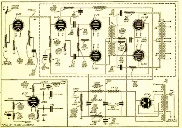 Este potente amplificador para sonido ambiente se encuentra en una documentación de 1941. La salida es push-pull mediante un transformador para inversión de fase. El circuito de 8 válvulas tiene una potencia de unas decenas de watts con varias salidas para altavoces.