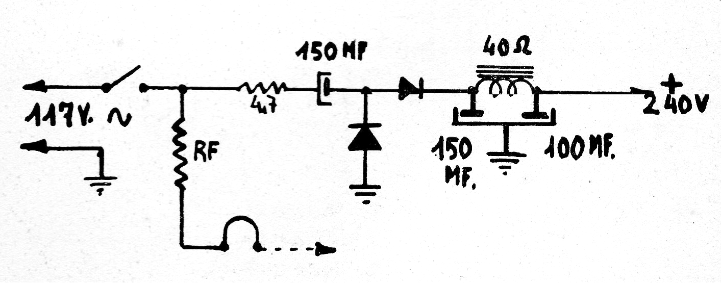 Esta fuente sin transformador para circuitos valvulados tiene un doblador que proporciona 240 V de salida a partir de la red de 110 V. Los diodos pueden ser los 1N4007 y eventualmente el choque puede ser sustituido por un resistor de 1k x 10 W. Tenga en cuenta que la fuente no está aislada de la red. La tensión de trabajo de los capacitores debe ser de al menos 350 V.