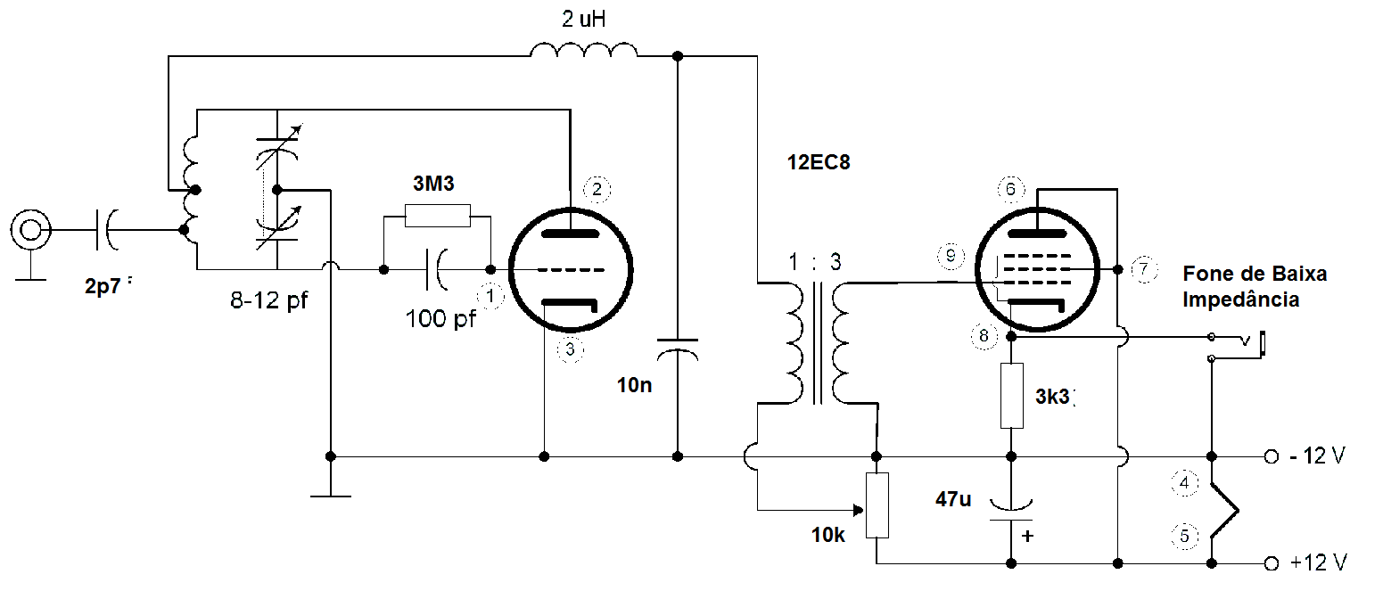 Esta simple radio de FM valvulado utiliza una válvula doble (triodo-pentodo) 12EC8 para recibir las señales y proporcionar escucha en auricular. La bobina consiste en 6 espiras de hilo 28 en una forma de 1 cm con tomas en las espiras 2 y 4. La antena debe ser del tipo telescópico y el condensador de sintonía se puede obtener en una radio FM fuera de uso. Una característica de este circuito es su operación con fuente simétrica de 12 V, no necesitando de alta tensión. La misma fuente, proporciona la tensión de filamento a las válvulas. El transformador es del tipo controlador que se encuentra en radios valvulares antiguos, pero se puede experimentar un tipo de baja tensión de radios transistorizados. Para el choque de RF enrole 20 a 25 espiras de hilo 30 a 32 en un resistor de 1 M x ½ W.