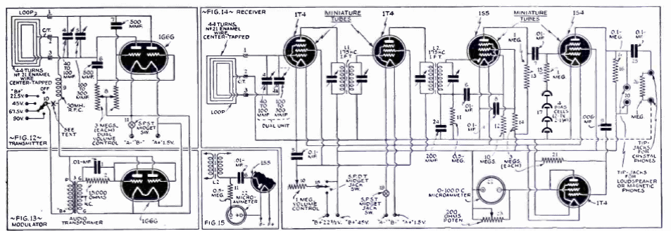 Este circuito es de un Radio Craft de la década de 1940. El circuito emplea 5 tubos y debe funcionar con baterías. Ver que el circuito es bastante crítico, sobre todo en relación a la bobina del sensor.