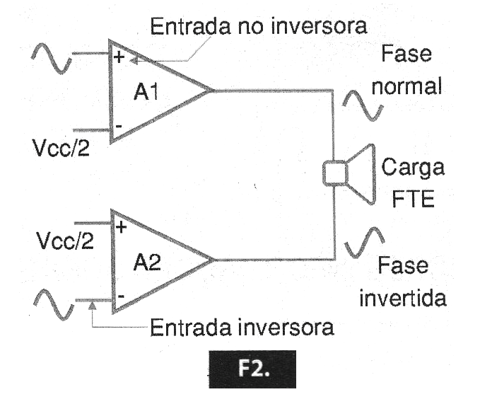 Sin embargo, para obtener una configuración BTL o puente no basta con tener dos amplificadores iguales. Si los amplificadores tienen entradas inversoras y no inversoras, el problema de la conexión en puente está resuelto, como muestra la figura 2.