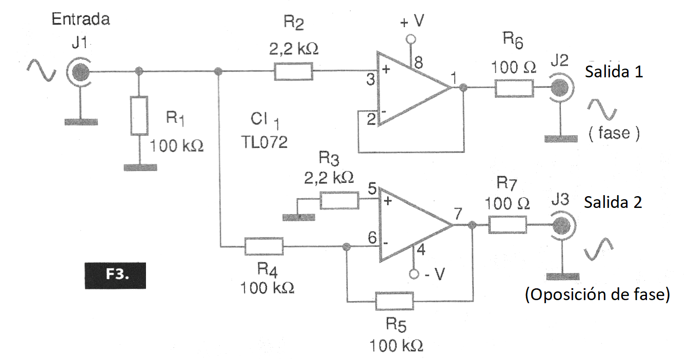 Sin embargo, si esto no ocurre, debemos tener un circuito que proporcione señales de la misma amplitud pero en oposición de fase para la excitación de estos amplificadores. Un circuito de este tipo se muestra en la figura 3.