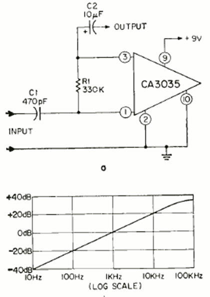 Encontramos este circuito amplificador de agudos en una revista Radio Electronics de febrero de 1970. Utiliza un circuito integrado RCA CA3035, lanzado en ese momento.