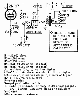 Este oscilador de un solo transistor fue encontrado en la revista Radio Electronics de febrero de 1962. El circuito utiliza un transformador en miniatura de la época y la energía proviene de baterías.