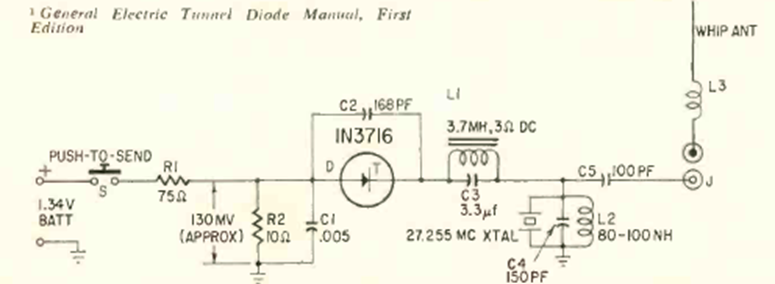 Este circuito lo encontramos en una Radio Electrónica del año 1963. Se puede utilizar para control remoto. La frecuencia depende de la bobina y la alimentación y lo suministra una sola batería.