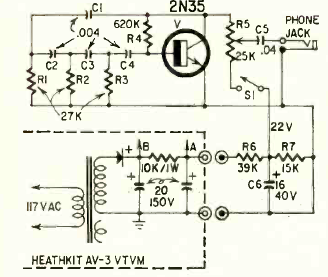 Este inyector de señal de banco, alimentado por la red eléctrica, se publicó en la revista Radio Electronics en abril de 1963. El circuito utiliza sólo 1 transistor que genera una señal de baja frecuencia sinusoidal.