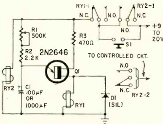 Este otro circuito de la revista Radio Electronics de junio de 1968 tiene un transistor controlador y un sistema de pestillo. El circuito proporciona retrasos de hasta 8 minutos dependiendo del valor de C1.