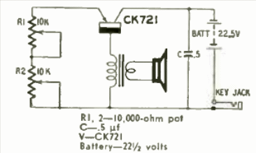 Este circuito de 1 transistor es de Radio Electronics de diciembre de 1958... El circuito funciona con baterías y utiliza auriculares de alta impedancia. El transistor es de germánio de la época.