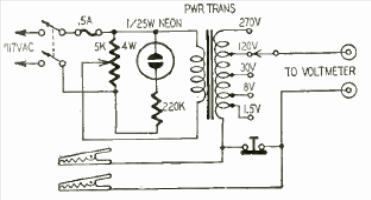 Este circuito fue publicado en la revista Radio Electronics de abril de 1958. Sirve para condensadores electrolíticos utilizando un multímetro como instrumento indicador.