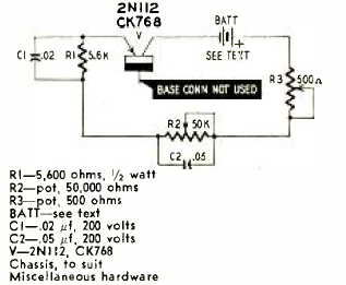 Este oscilador aprovecha el voltaje de ruptura inverso entre el colector y el emisor. El circuito que debe alimentarse con 22,5 V fue publicado en la revista Radio Electronics en agosto de 1959.