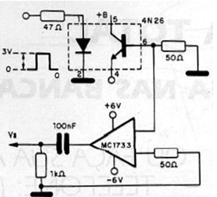 Este circuito es sugerido por Motorola, utilizando un acoplador tipo 4N26 y un operativo tipo MC1733. Sin embargo, la configuración se puede experimentar con componentes equivalentes. Con esta configuración, los tiempos de conmutación se pueden reducir de 2 a 3 us a 100 ns normalmente. El amplificador operacional debe recibir alimentación simétrica y la señal de entrada debe ser rectangular con una amplitud de 3V. Para este tipo de señal la salida sube del 10% al 90% de 0,6 V en aproximadamente 100 ns.