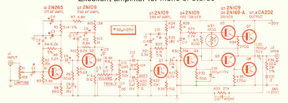 Utilizando transistores de época, este amplificador de 10 W se encontró en la revista Radio Electronics de mayo de 1963. Los transistores de potencia deben montarse en disipadores de calor.