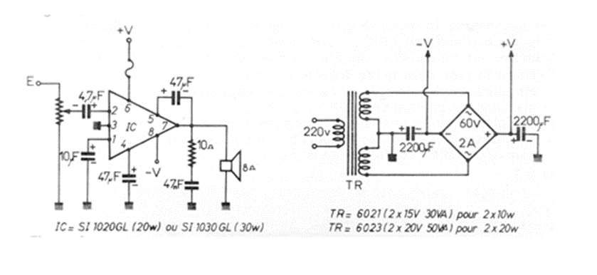 Este amplificador utiliza módulos híbridos Sanken que todavía se pueden encontrar en algunos proveedores, ya que también se utilizan en circuitos de automatización y control. Puede proporcionar potencias de 20 o 30 W, dependiendo del módulo utilizado y de la fuente de alimentación. El circuito requiere una placa bien planificada y una buena área de disipación para el módulo híbrido. La calidad de sonido obtenida es excelente ya que el módulo se utilizó en varios productos comerciales de la época (años 70 y 80).