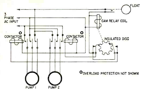 Este circuito alterna la activación de dos bombas en función de la posición del flotador. El circuito fue encontrado en la revista Radio Electronics de octubre de 1961. Los relés son tipos de corriente alterna.