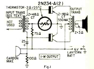 Este circuito con dos transistores de potencia fue encontrado en la revista Radio Electronics de octubre de 1960. Lo micrófono es de carbono y funcionan con una potente batería.