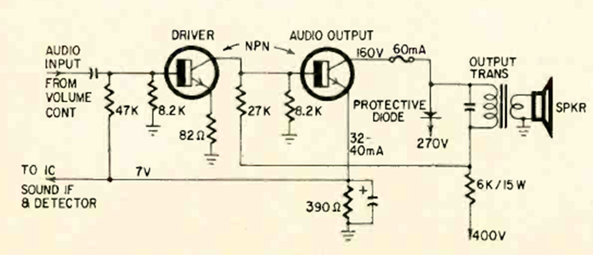 Este es el típico amplificador de audio para un televisor del año 1967. Lo encontramos en una revista de la época. Tenga en cuenta el uso del transformador de salida y la alta tensión de alimentación. El circuito es un RCA CTC21.