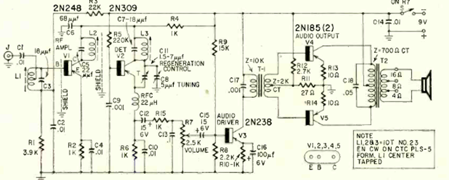 Este receptor de 5 transistores se obtuvo de un artículo de la revista Radio Electronics de febrero de 1969. El circuito tiene una etapa de audio clase B y 3 transistores en las etapas anteriores, presentando una buena ganancia a 30 MHz.