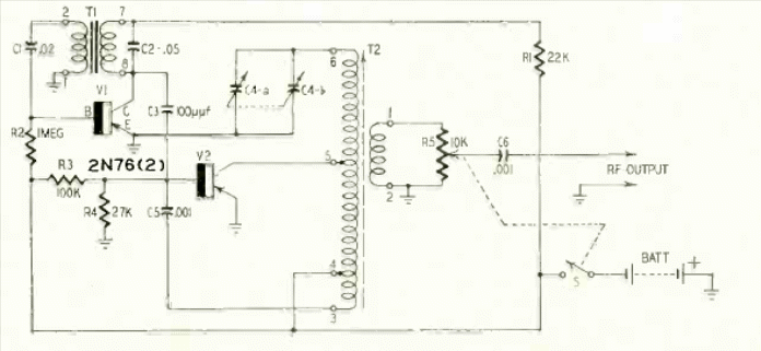 Este sencillo generador de señales con transistores fue publicado en la revista Radio Electronics en noviembre de 1957. El circuito genera señales determinadas por la bobina y la modulación por el transformador.