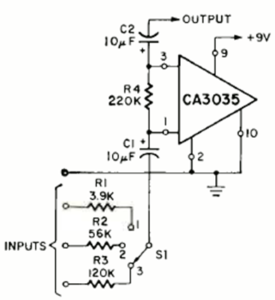 Este circuito es de Radio Electronics de febrero de 1970. El circuito selecciona la sensibilidad de entrada cambiando resistencias. El circuito integrado es un tipo de época.