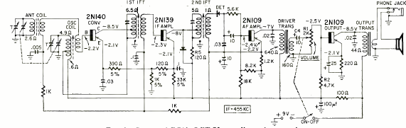 Esta radio comercial RCA tuvo su circuito publicado en la revista Radio Electronics en agosto de 1959. El circuito de 4 transistores era de tipo súper heterodino con salida de altavoz.