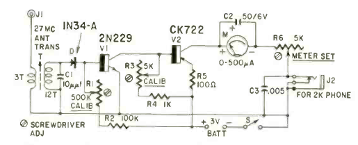Este medidor de intensidad de campo para un alcance de 11 metros se encontró en la revista Radio Electronics de octubre de 1960. El circuito utiliza un indicador analógico y tiene dos transistores.