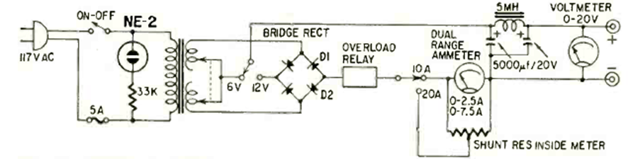 Esta fuente de baja tensión no regulada se encontró en la revista Radio Electronics de julio de 1962. Los voltajes y las corrientes dependen del transformador. Básicamente hay dos voltajes en el rango indicado.