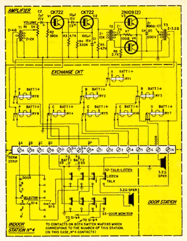 Este circuito, que apareció en la revista Radio Electronics de junio de 1962, utiliza 4 transistores. El alcance depende de las pérdidas en los cables y la conmutación se realiza mediante relés.