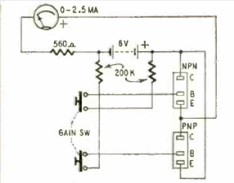 Este circuito es de un modelo de prueba de transistores comercial que se encuentra en la revista Radio Electronics de marzo de 1958. El circuito utiliza un indicador analógico.