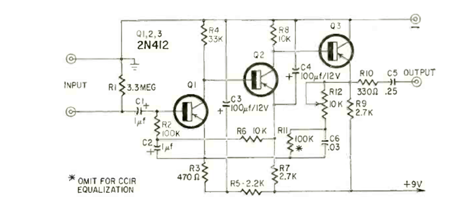 Este circuito fue encontrado en la revista Radio Electronics de octubre de 1964. El circuito utiliza dos transistores de la época que requieren una tensión de alimentación de 9 V. El consumo es de 2,5 mA.