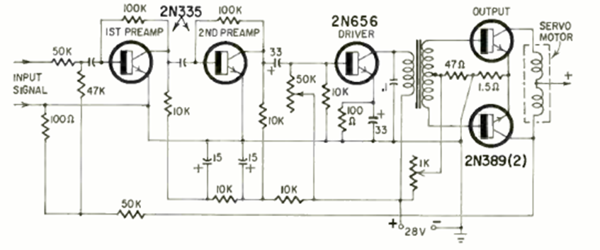 Este circuito es de una Radio Electronics de julio de 1965. El circuito utiliza componentes de la época controlando también un servo de la época. La fuente de alimentación es de 28 V.
