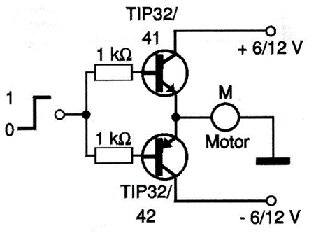 Este es un control de dirección de rotación para un motor pequeño de hasta aproximadamente 2 A con los transistores indicados. El circuito se puede utilizar como escudo para microcontroladores o en otras aplicaciones. Los transistores deben estar equipados con disipadores de calor.