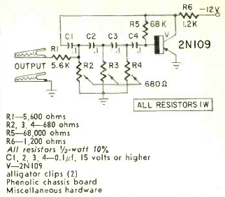 Este oscilador de cambio de fase con transistor genera señales sinusoidales en el rango de audio. El circuito fue publicado en la revista Radio Electronics en diciembre de 1959.
