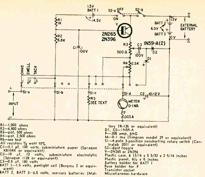 Este circuito fue encontrado en una revista de Radio Electronics de junio de 1962. El circuito es para coches de la época con encendido de platino. La indicación se realiza en un instrumento analógico.