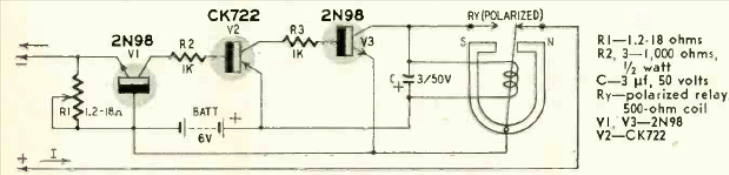 Este interruptor de corriente fue encontrado en una Radio Electrónica de noviembre de 1957. Se activa mediante la corriente determinada por el sensor electromecánico, un relé polarizado de la época.