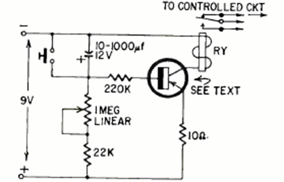 Hallado en una Radio Electrocs de mayo de 1964, este circuito activa un relé en función de la tensión de alimentación. El tiempo lo da el capacitor, el cual debe ser de buena calidad, ya que las fugas pueden afectar el funcionamiento.