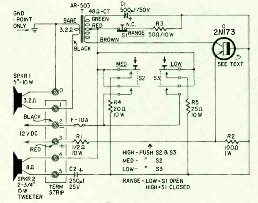 Este circuito produce sonidos de 6 notas diferentes dependiendo de las teclas activadas. El circuito procede de una Radio Electronics de mayo de 1965. El transistor debe estar equipado con un radiador de calor.