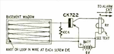 Este circuito fue publicado en la Revista Radio Electronics de febrero de 1958 utilizando el conocido CK722, uno de los primeros transistores comerciales. El circuito activa un relé cuando se cortan los finos cables que protegen la ventana.