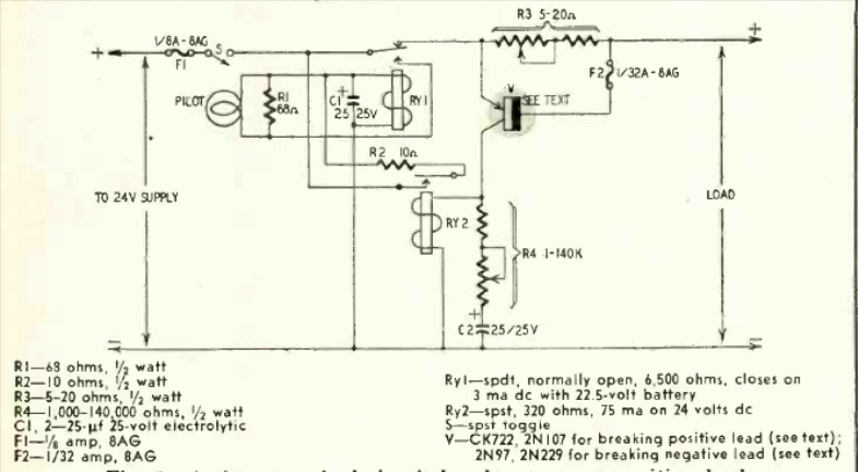 Este circuito de protección para líneas eléctricas se encontró en un Radio Electronics de noviembre de 1957. El transistor utilizado puede ser cualquier transistor de propósito general como el CK722.