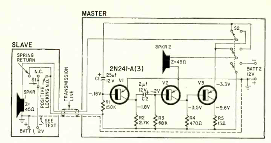 Este circuito con tres transistores fue propuesto en una revista Radio Electronics de febrero de 1963. Los transistores son modelos de la época. La energía proviene de una batería de 12 V.