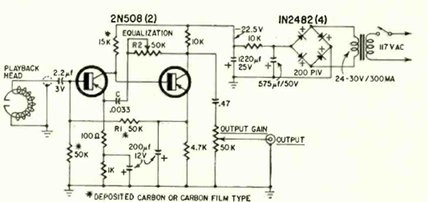 Este amplificador para cabezales de grabación se encontró en Radio Electronics de septiembre de 1963. El circuito utiliza transistores de época, pero se puede modificar para que funcione con transistores modernos.