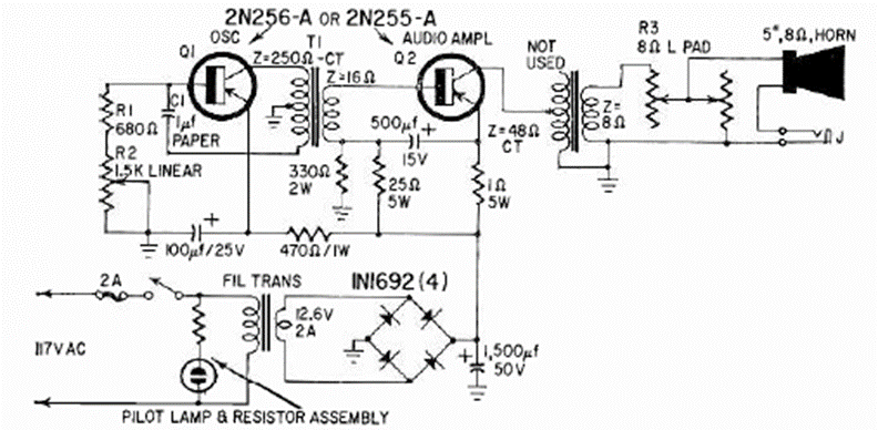 Este circuito de dos transistores consta de una potente sirena de uso industrial. El circuito es de una Radio Electronics de noviembre de 1963. Se incluye la potente fuente de alimentación.
