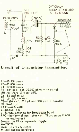 Este circuito aplica una señal al extremo de un cable incorporado para que pueda seguirse con un receptor de radio portátil. El circuito fue publicado en la revista Radio Electronics en diciembre de 1960.