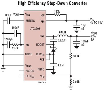 Este circuito consta de un convertidor Step-Down (reductor de voltaje) que puede proporcionar una salida de 5 A con entradas de 4 a 18 V. La configuración que se muestra en la figura está basada en el circuito integrado LTC3608 de Linear Technology (www.linear.com ), que tiene el MOSFET de potencia en el chip y una referencia de precisión interna. El circuito es estable con capacitores cerámicos en la salida y además tiene características como límite de corriente ajustable, arranque suave programable y protección contra sobretensión de salida. Otra característica importante de este circuito es su eficiencia, que alcanza el 95% con una corriente de salida en el rango de 2 a 4 A, para una tensión de entrada de 12 V y un voltaje de salida de 2,5 V. El circuito integrado utilizado se suministra en 7 x carcasa QFN de 8 mm. La tensión mínima de salida es de 0,6 V y la frecuencia de conmutación es de 1 MHz.