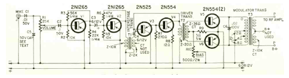 Este amplificador modulador de transmisor para la banda de 11 metros (CB) se publicó en la revista Radio Electronics en noviembre de 1961. El circuito es para uso en un transmisor de automóvil.